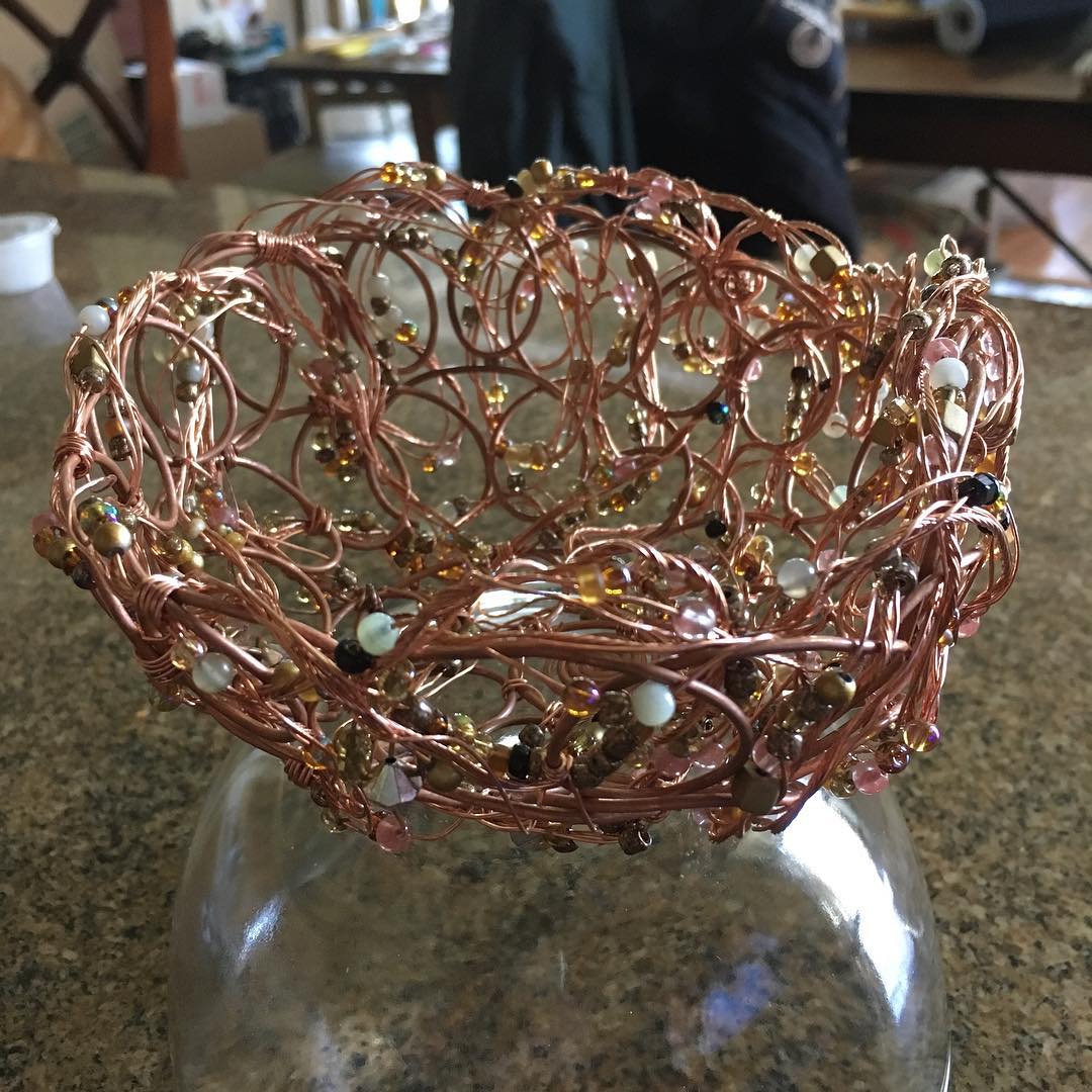 Free-form wire bowl embellished with beads. Circumference about 11″ .